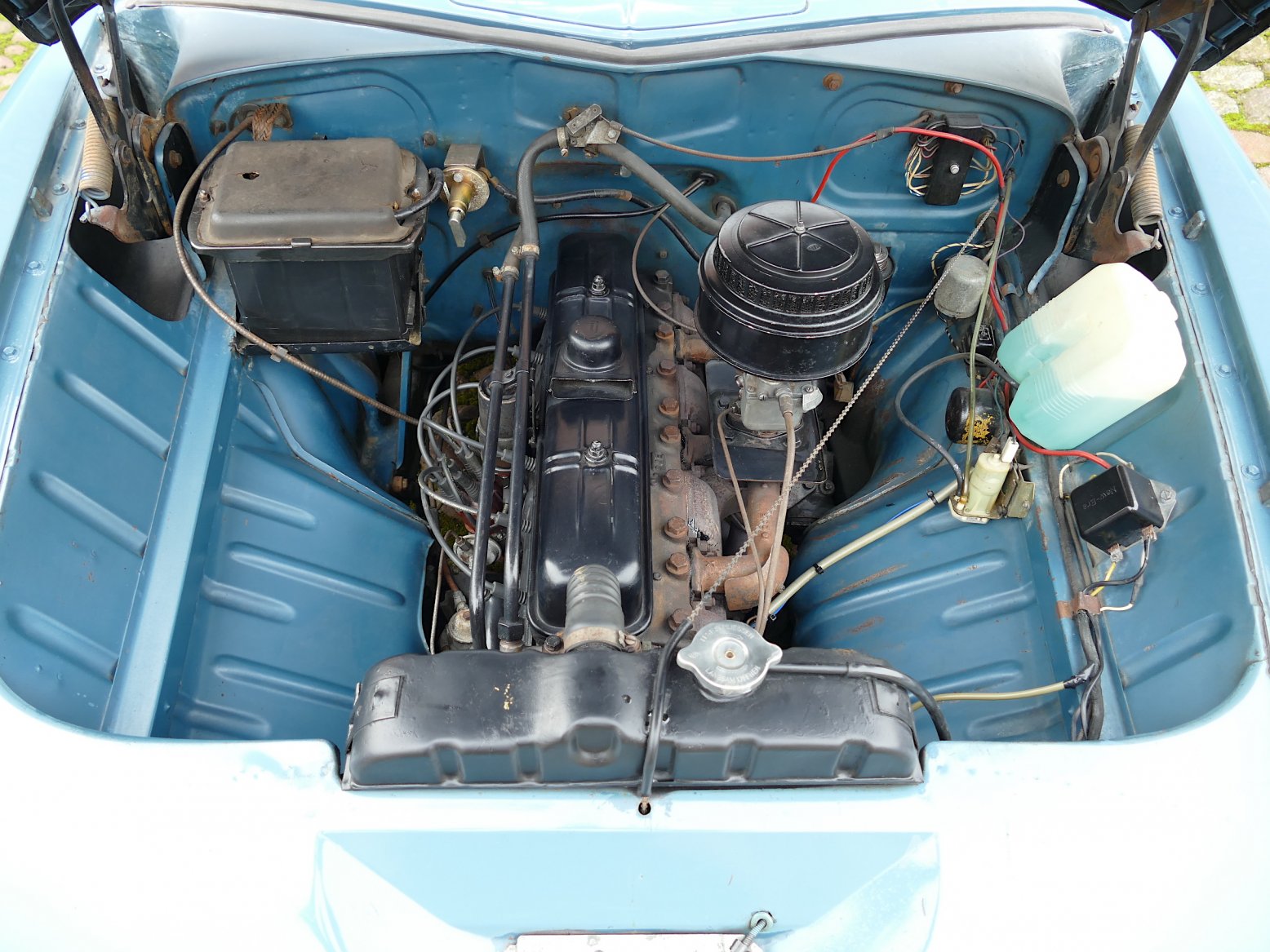 Zum Verkauf steht ein mittlerweile sehr seltener und wunderschöner Opel Kapitän aus dem Jahr 1956. Das Auto wurde neu nach Schweden ausgeliefert und hatte dort nur wenige Besitzer. Der Erhaltungszustand ist wirklich toll und die Karosserie ist dank damals, salzfreier Strassen beeindruckend. Das gesamte Auto wurde immer gepflegt und instand gehalten und musste niemals komplett restauriert werden. Der Chrom sowie Lack und Interieur haben natürlich Gebrauchsspuren aber sind wunderbar erhalten. Der original Reihensechszylinder mit Seitendeckel läuft wie man es von einem Opel erwartet weich und sehr leise. Die Lenkradschaltung lässt sich ohne Mühe bedienen und alles fühlt sich exakt und gut an. Das Auto fährt ohne holpern und klappern sehr komfortabel auch über unebene Strassen. Im Handschuhfach befindet sich neben der original Bedienungsanleitung sowie Garantiekarte die kleine Handkurbel zum Aufzug der Borduhr! Im Fußraum steckt in der Halterung noch das original Serviceheft. Ein tolles Auto aus einer Zeit, als Opel noch echte Autos gebaut hat. Das Cockpit ist einmalig im Design und alles ist gepflegt und funktioniert.